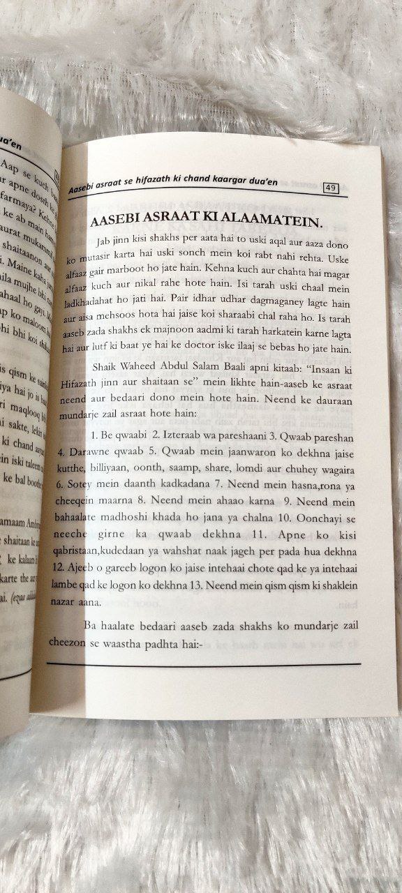 “Ye kitab Aaseebi Asraat ki Duaein jinn, jadoo, nazar-e-bad aur seher jaise ruhaani masail ka ilm aur un ka sharayi ilaaj batati hai.